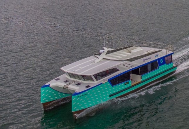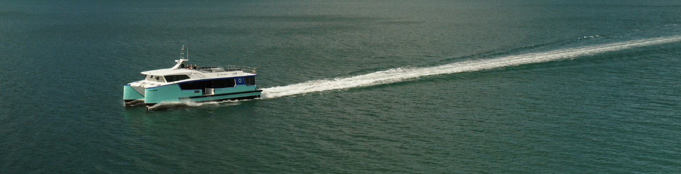 The Ika Rere is a 28 tonne, 19m, carbon fibre, twin-hull fully electric ferry capable of carrying 132 passengers at 20 knots. The vessel is powered by an independently supplied 325kW liquid cooled electric AC motor in each hull. Two banks of Lithium-Ion liquid-cooled batteries totalling 5500kg and providing 550kWh of installed capacity are used to drive the two motors.